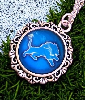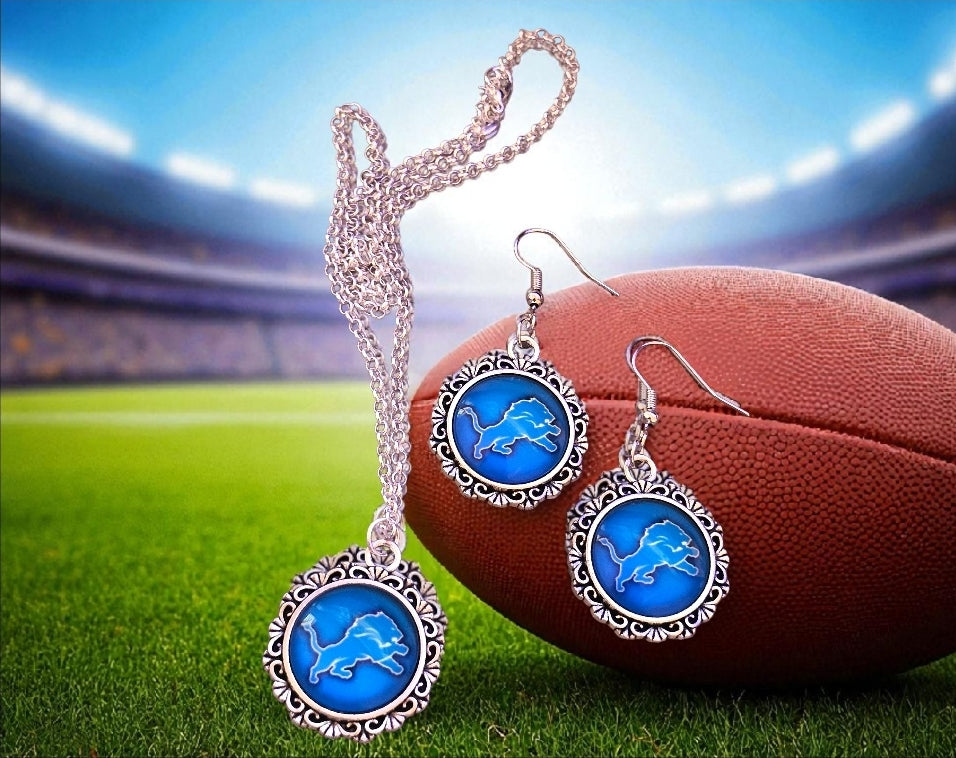 Lions sports Football earrings and necklace. Earrings Round metal dome charm. Matching necklace on a sterling silver chain.